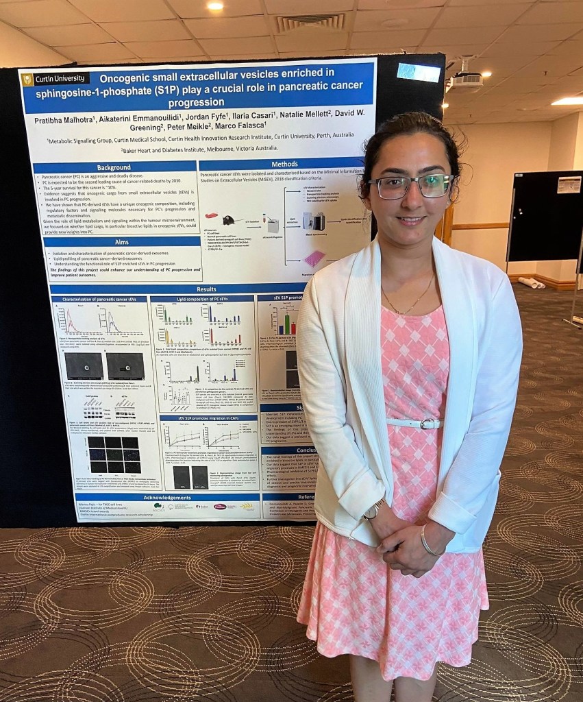 Pratibha Malhotra – Professor Marco Falasca’s PhD student, received the student poster award from the Australia and New Zealand Society of Extracellular Vesicles Conference on the Gold Coast in 2022.